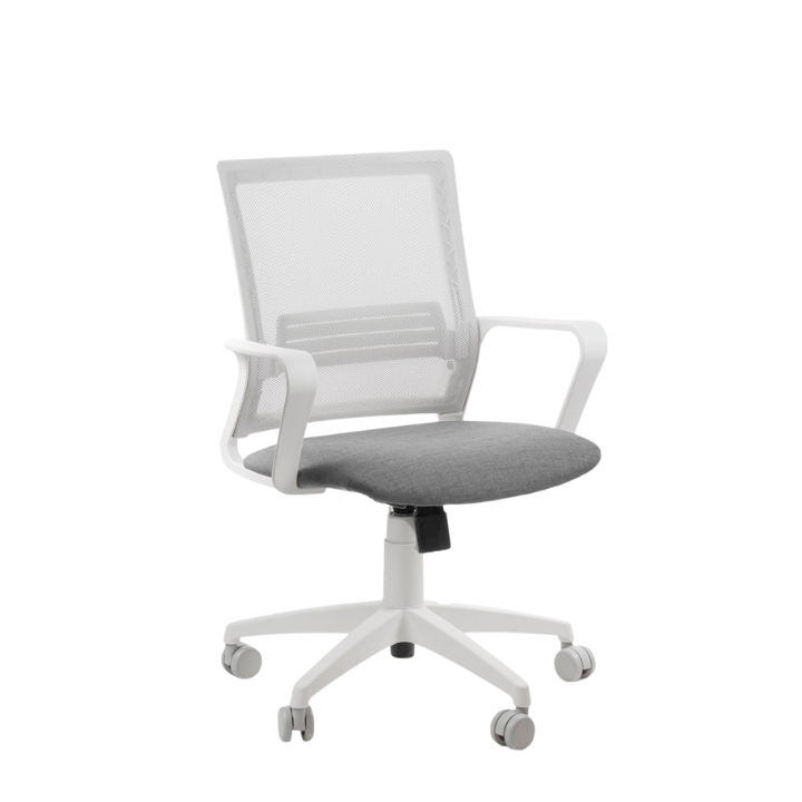 - Respaldo tapizado en tela de red mesh gris medio.